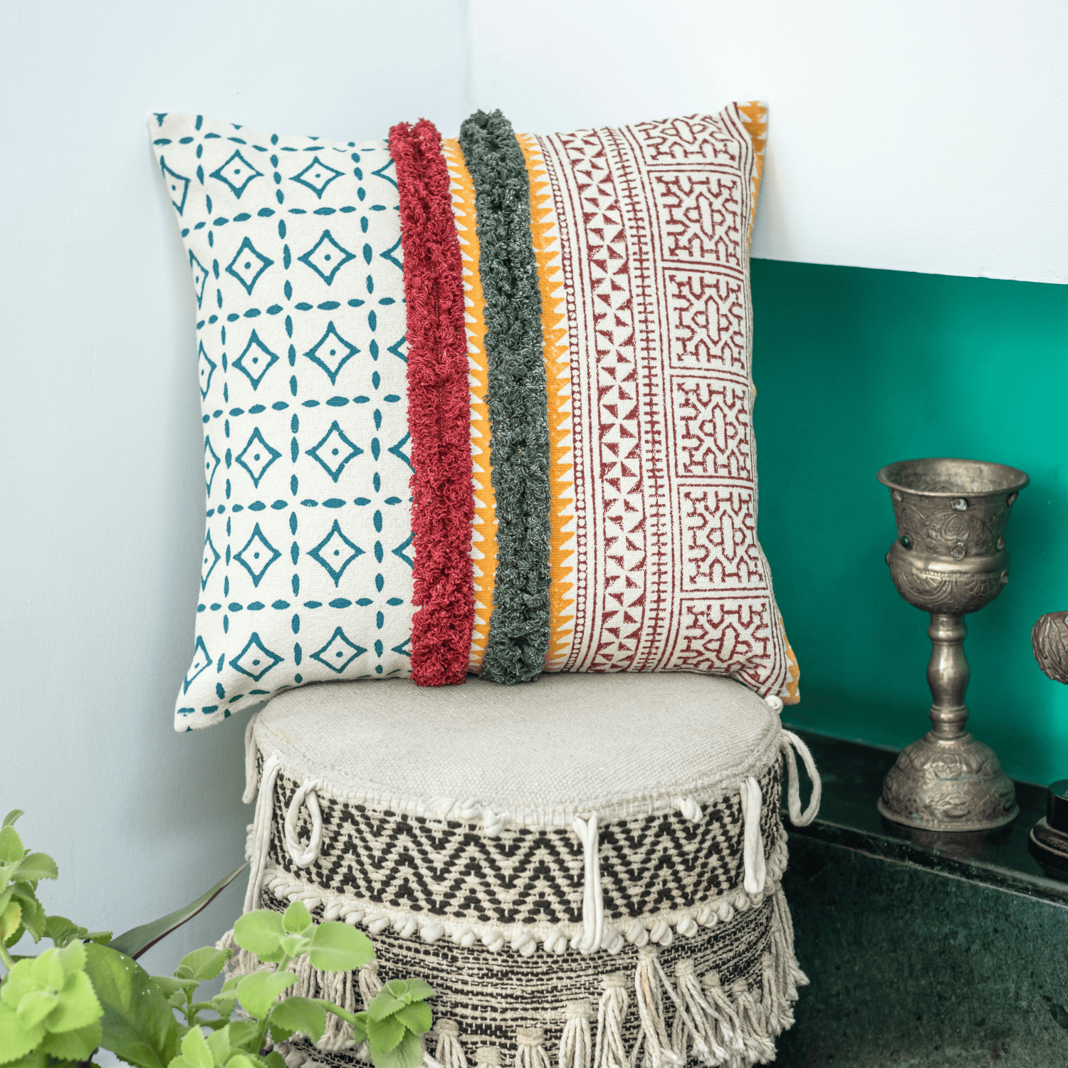 Vivid and textured, the "Tribal Weave" cushion cover fuses ethnic motifs with bold color blocking. Hand block printed in contrasting panels of teal diamonds and terracotta tribal forms, it features raised tufted stripes in red, forest green, and golden ochre — adding layers of depth and playful contrast to its composition.
