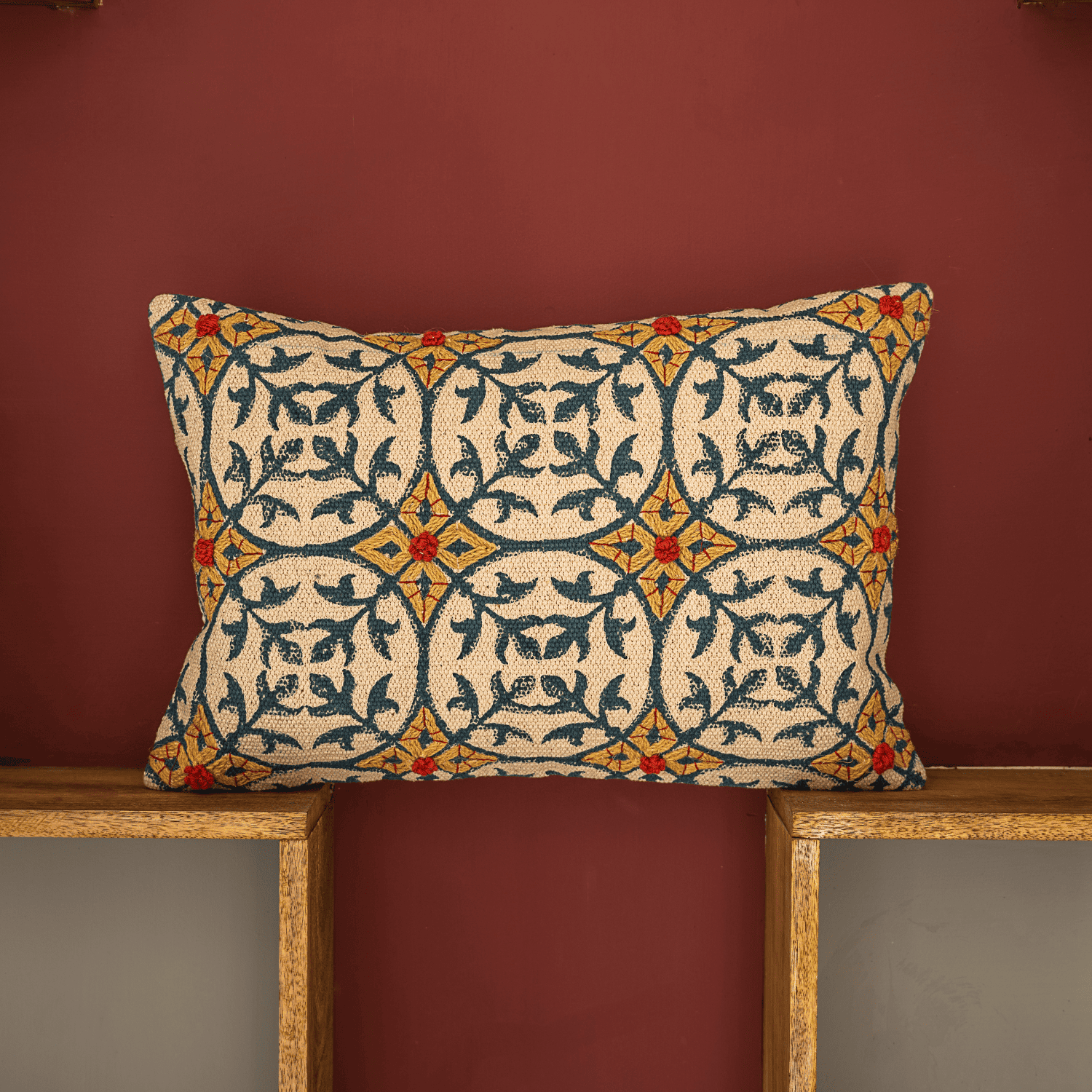 Classic and intricate, the "Verdant Bloom" cushion cover is crafted from heavy cotton and features a delicate hand-embroidered vine motif arranged in elegant medallions. Accents of golden yellow and rich red embroidery punctuate the pattern, adding warmth and artisanal flair to the deep teal leafy design.